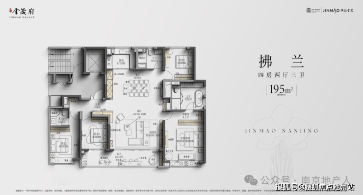 建面约195㎡的四房两厅三卫,四开间朝南