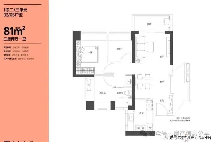 81㎡的3房2厅1卫,设计的是竖厅格局,LKDB一体化设计,进门入户玄关,有1个次卧做的双飘窗,U型厨房,卫生间三段式分离,得房率:74.34%(不含赠送),全部西北朝向。