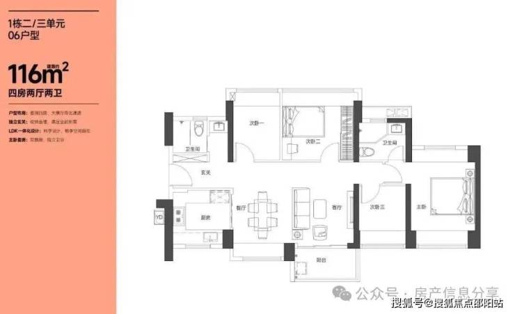 116㎡的4房2厅2卫,设计的是横厅南北通透格局,LKDB一体化设计,进门入户玄关,五开间朝南,超大宽面,主卧南北通设计,U型厨房,得房率:74.35%(不含赠送),阳台主朝东南向。