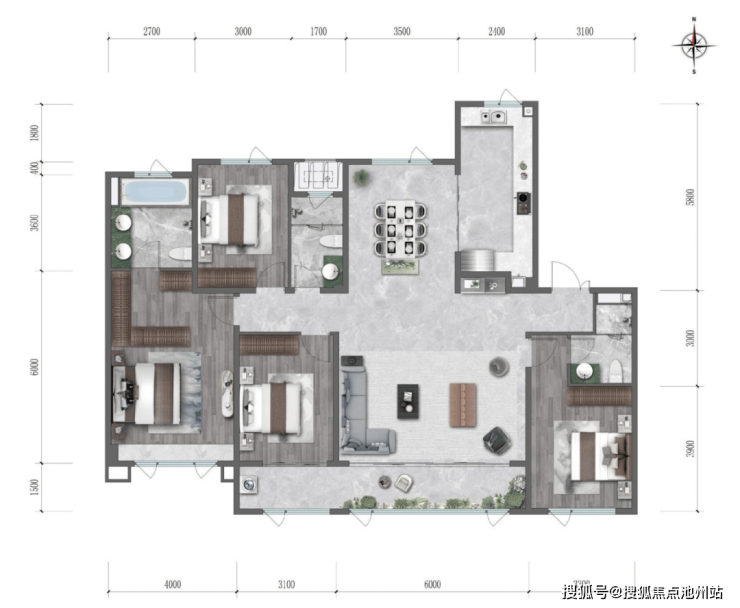 190户型为四室两厅三卫产品,南向4.5面宽,开间长度达到了16.4米,其中阳台面宽开间为9.1米。南向打造两个主卧套房,其中主人房更是打造了带有步入式衣帽间的总统套房。独立的客厅-餐厅-厨房,客厅的开间长达6米,放一架钢琴也是绰绰有余。厨房的开间则达到了5.8米,如此尺寸在整个济南也是罕见。