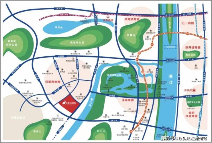 【洋湖之上 环境优越】一带:靳江河风光带(规划中)二山:周边有桃花岭、岳麓山等自然景观三园:自建约3万方中央公园、外瞰洋湖国家湿地公园(含已开放洋湖体育公园)、象鼻窝森林公园【交通便捷 畅达全城】公交线路:276路、378路、206路、235路、23路、356路、389路、38路、905路、908路等10余条地铁:规划11号、13号线过江大桥:猴子石大桥、湘府路大桥、黑石铺大桥高速交通:接驳长潭西、长韶娄、绕城高速口、麓景路南延线(含浦/梅溪湖10分钟实现无缝对接)