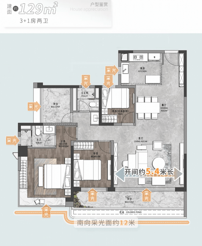 刚加推的129㎡四房两厅两卫热度较高,总价580-640万,纯南向正对社区中央园林,超8米观景阳台连通次卧,客厅开间超5米