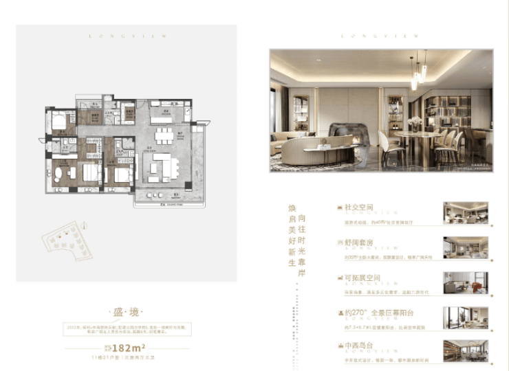 182㎡大四房为改善顶配户型,总价820-910万,采用LDK一体化设计,搭配13米环绕式阳台