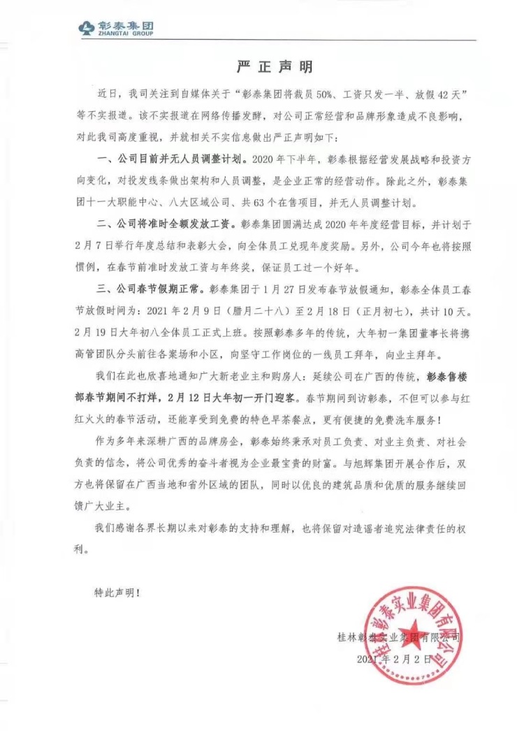 焦点财经快讯 徐准 2月2日,针对此前网传的“彰泰集团将裁员50%、工资只发一半、放假42天”的报道,桂林彰泰实业集团有限公司发布严正声明。