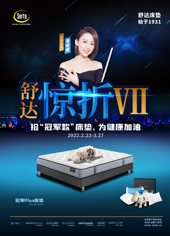 据了解,舒达“惊折Ⅶ”活动于2022年2月23日在全国启动,即日起,消费者到店可享受多款“冠军款”床垫超值放送活动,助您体验到“冠军”般的优质睡眠。如果您想智能睡眠升级,可以关注iComfort智能系统“充能套装”,帮助人们体验智能睡眠,快速“充电”,恢复体能。