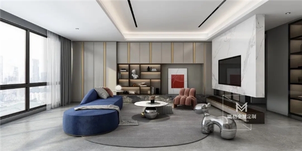 在色彩搭配中,白色作为经典色彩,将它与高级灰组合,不仅降低空间的设计难度,又能满足对高雅格调的追求;在整体素雅的空间中,穿插蓝色壁画、家具,为空间注入梦幻浪漫的独特即视感。