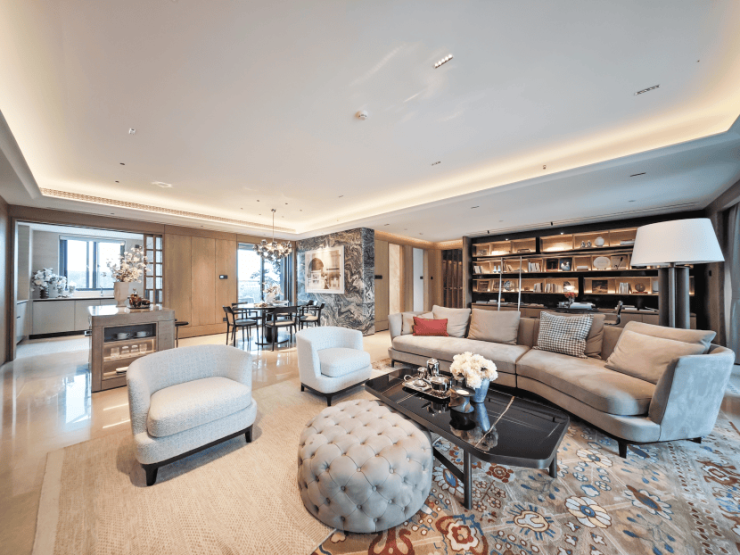 当前主推的建面约180㎡户型,将改善生活的理念体现得淋漓尽致。从归家的第一刻起,玄关拼花以及石材背景墙便带来了满满仪式感。但真正的重头戏是巨大的LDKB一体化厅,整个起居空间完全打通,若将次卧打通,可以形成一个超80㎡的超级家庭核心区。