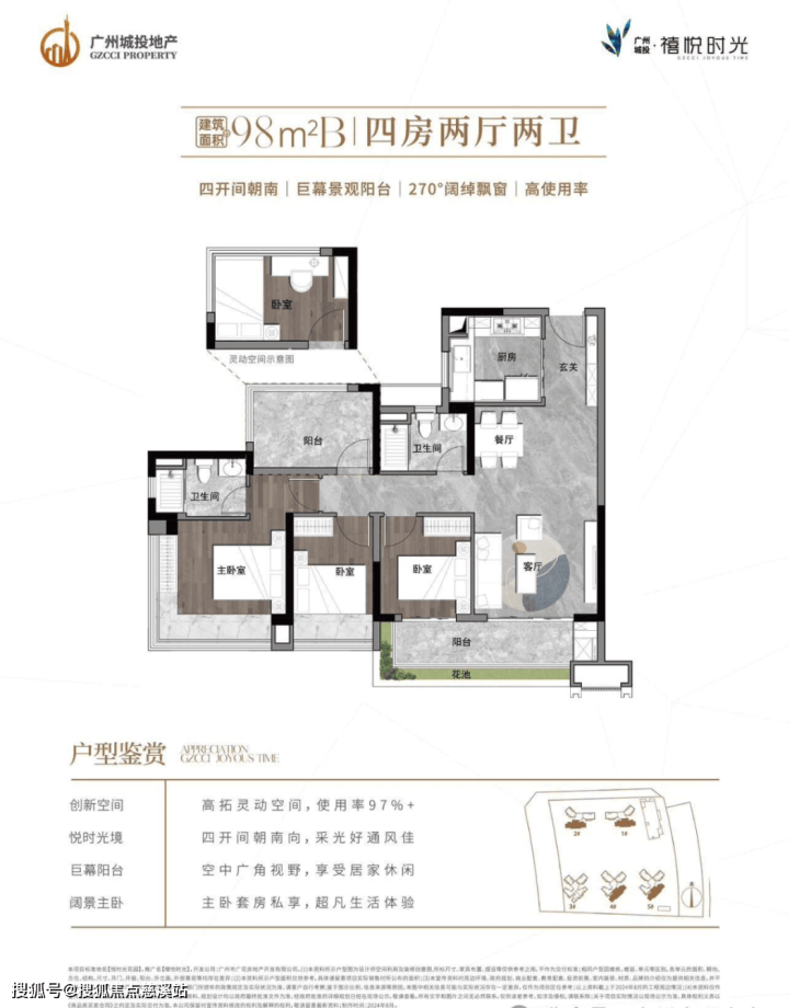 约 98㎡A 户型(四房两厅两卫):同样具备巨幕景观阳台,客厅南北对流,设有独立主卧套房,使用率高达 100% 以上。多一室灵动空间,增加了户型的实用性,南向大面宽阳台,视野开阔。