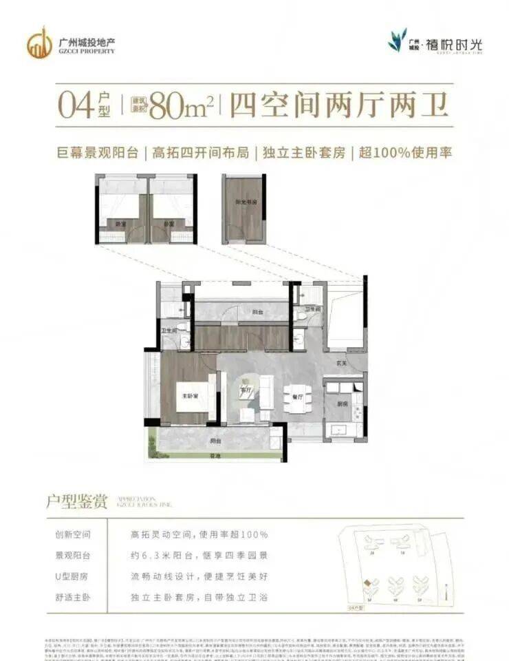 新加推80㎡户型(四房两厅两卫):6.3米宽阳台,使用率超100%!整个花都首个80方能做4房户型!