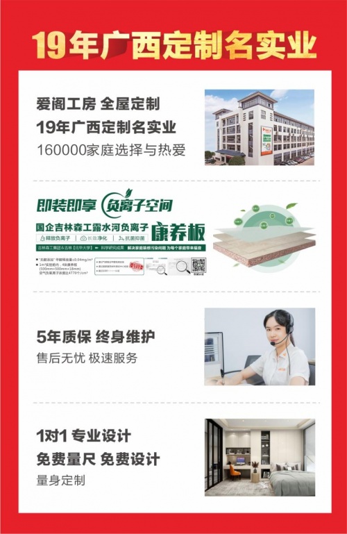 一直以来,爱阁工房都以服务与质量获得客户的认可与赞扬,也正是其对高质服务的培养和优良产品的铸造,成就了其目前其在广西全屋定制行业的先进地位。16万家庭信赖和选择爱阁工房,高颜值高品质高环保有保障!您的315,就是我们的365爱阁工房让您买得开心,用得放心,省钱省心享受高品质生活!