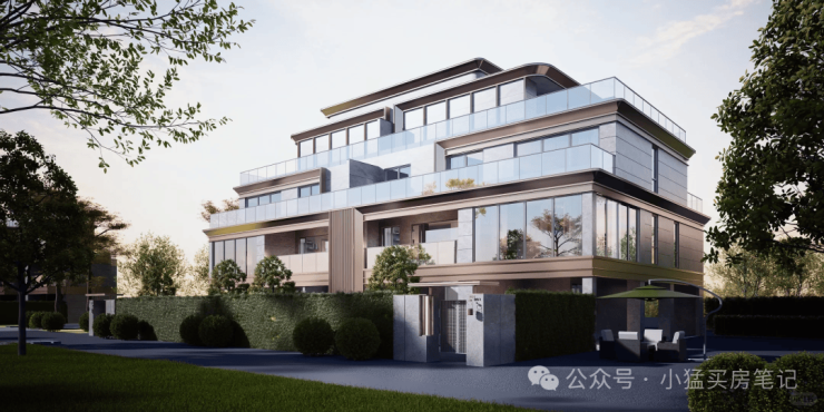 首推1、11、12栋大平层,采用板楼设计,外立面用大幅玻璃幕墙+铝板,开窗面积大,采光和视野通透。