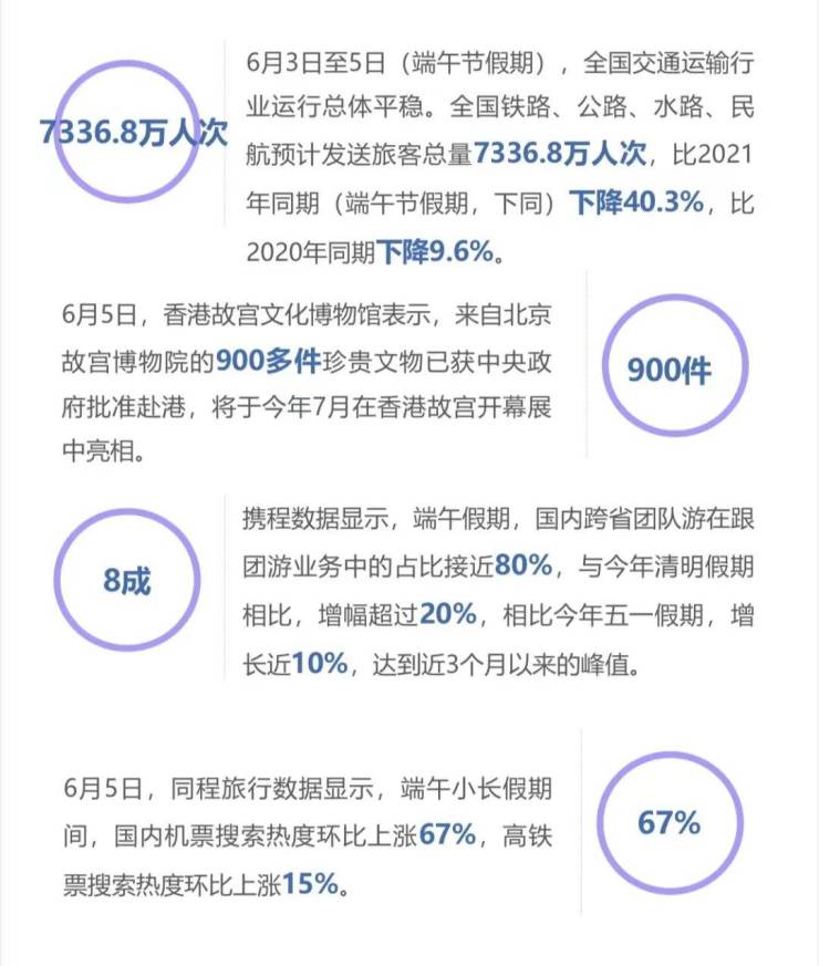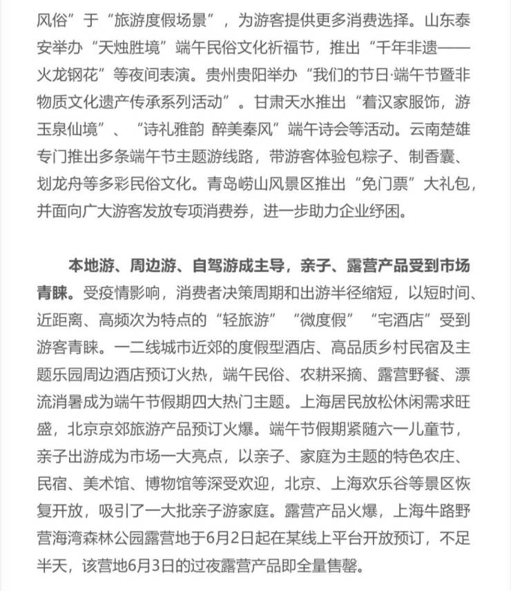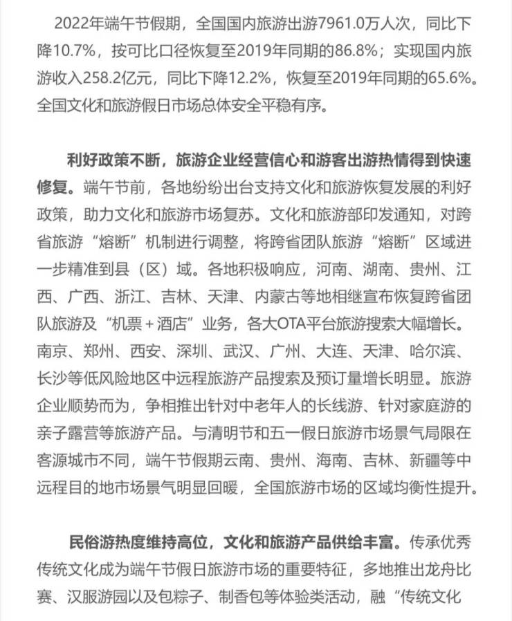 本周,文旅部发布2022年端午节假期旅游出游数据,全国国内旅游出游7961.0万人次,同比下降10.7%,按可比口径恢复至2019年同期的86.8%;实现国内旅游收入258.2亿元,同比下降12.2%,恢复至2019年同期的65.6%。全国文化和旅游假日市场总体安全平稳有序。