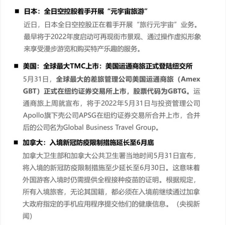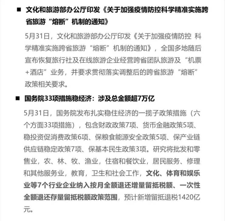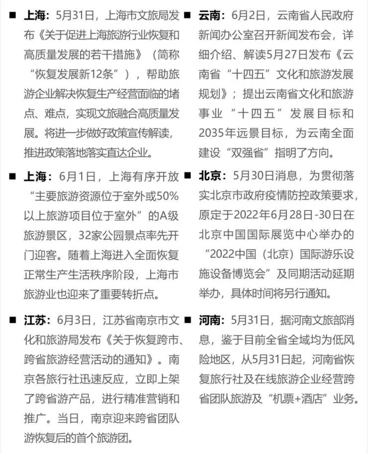 本周,文化和旅游部办公厅印发《关于加强疫情防控 科学精准实施跨省旅游“熔断”机制的通知》,全国多地随后宣布恢复旅行社及在线旅游企业经营跨省团队旅游及“机票+酒店”业务,并要求贯彻落实调整后的跨省旅游“熔断”政策相关要求。