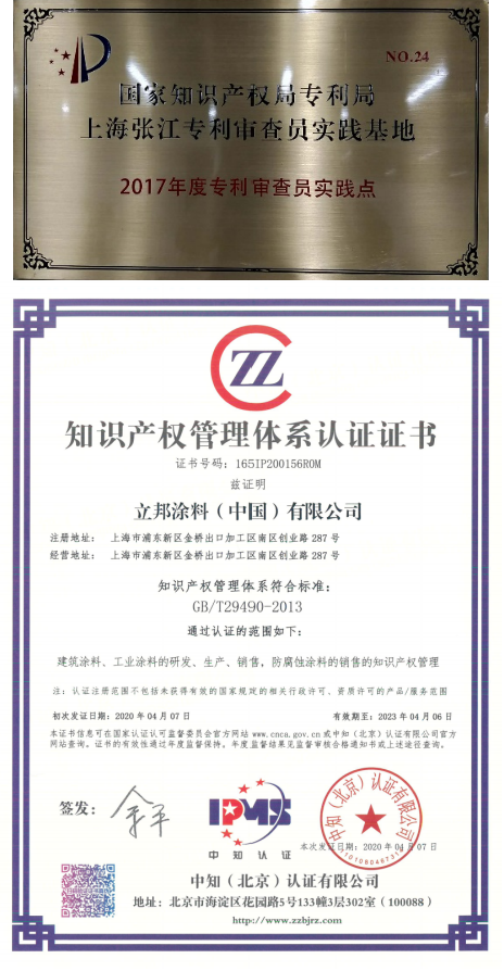 2021年是立邦中国的知识产权奖项收获年。今年3月,立邦中国凭借《高性能超支化聚合物及其在汽车原厂涂料中的应用》成功入围长三角高价值专利大赛复赛。这是对立邦知识产权高质量创造和高效运用的肯定。本次获评上海市专利工作示范企业也是对立邦市级典范作用的认可。此外,立邦还获得了“国家知识产权局张江审查员实践基地”、“上海市专利试点企业”等荣誉称号;其知识产权管理体系工作成功通过了国家知识产权管理专业机构评审,荣获《知识产权管理体系认证证书》。