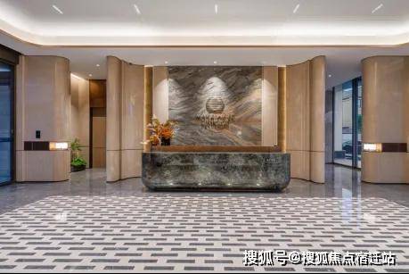 酒店式的社区大堂:精致的迎宾水景、苍劲滴翠的罗汉松,为城市的界面,增添一抹亮色,也让当代年轻人,在享受现代都市生活的同时,感受到家的温暖和亲切。蓝翡翠的奢石,以深邃幽远的尊蓝色基底,尽显光彩下的神秘奢华;而顶部异形的仿铜星空顶设计,用香槟金色斜角造型铝板搭配熠熠灯光,碰撞出科技与艺术的美学。