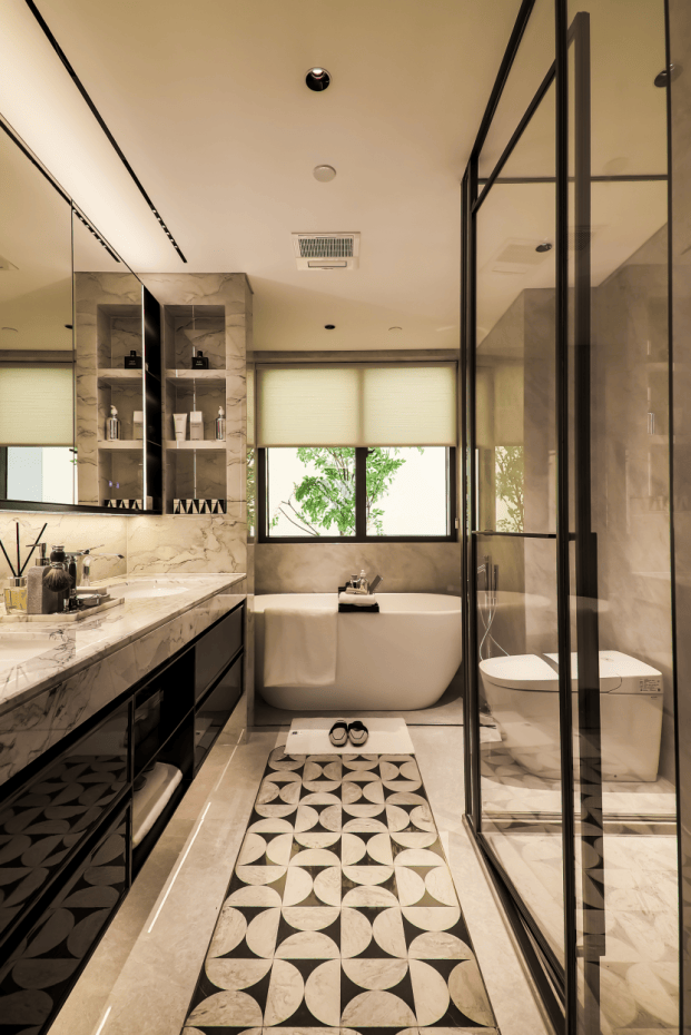 在居住的私密性与舒适度方面,该户型做到双主套设计,给了夫妻双方同等的尊重和私密。主卧配置五星级酒店式主卫,涵盖双台盆、独立浴缸等,在瞰景窗边泡个澡,一天的疲惫都烟消云散。这种体验,以前只能在高端酒店享受,现在天天都能拥有。