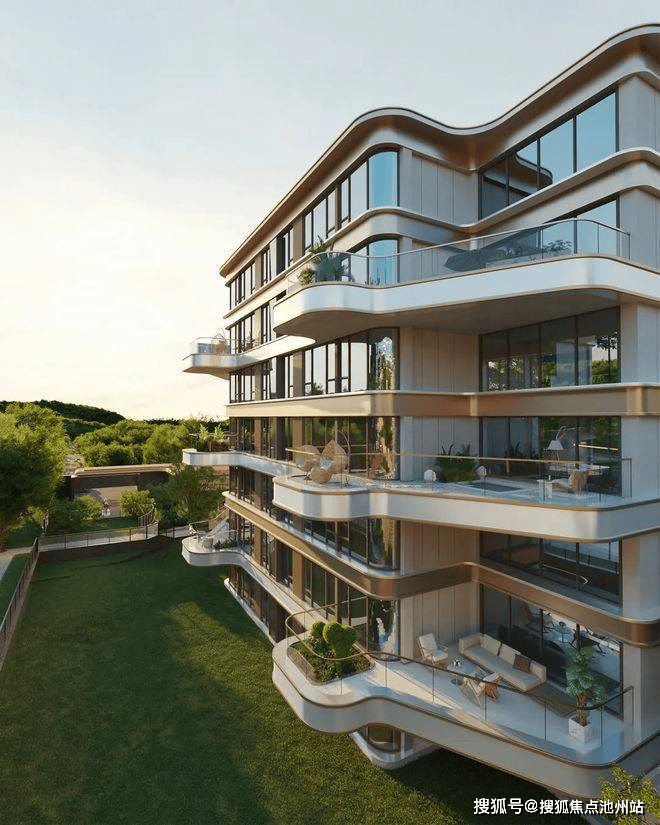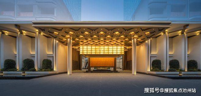 社区主入口以伦敦梅费尔瑰丽酒店为设计原型,打造了气势恢宏的酒店式门仪,200米宽的酒店式门仪,近7米高檐口,16根柱廊排成序列,步入其中宛如穿越高端酒店的入户长廊,气场瞬间拉满;点睛之笔「明瓦灯笼」,近10米宽、6米高的巨型光影装置,金色雨棚与玉石纹理透光材质巧妙衔接,下方是粼粼水景,光影流转间,直接点亮归家的仪式感。