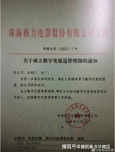 2022年3月,一份网传图片显示,格力电器在企业内部官宣成立数字化渠道管理部,并聘任王自如为数字化渠道改革项目负责人,统筹数字化渠道管理工作实施。