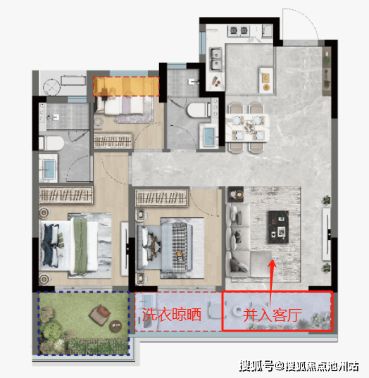 在户型设计时,项目将包好的生活阳台做到完全室内化。