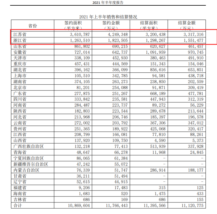 就上半年的销售业绩来看,新城控股在江苏、浙江的签约金额位居前两位,分别达到了424亿元及182亿元的签约金额,而这两省的签约面积及结算金额也都位居全国的前列。此外,其他城市销售额则保有均衡的业绩贡献度。