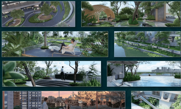 利用裙房,将项目整体抬升近20米,使住宅景观无遮挡,北望珠城/琶洲CBD、广州塔璀璨繁华,南瞰超万亩湿地自然生态风光然河涌,并沿途打造了开放式街角公园,与社区园林无边界衔接,景观优美。