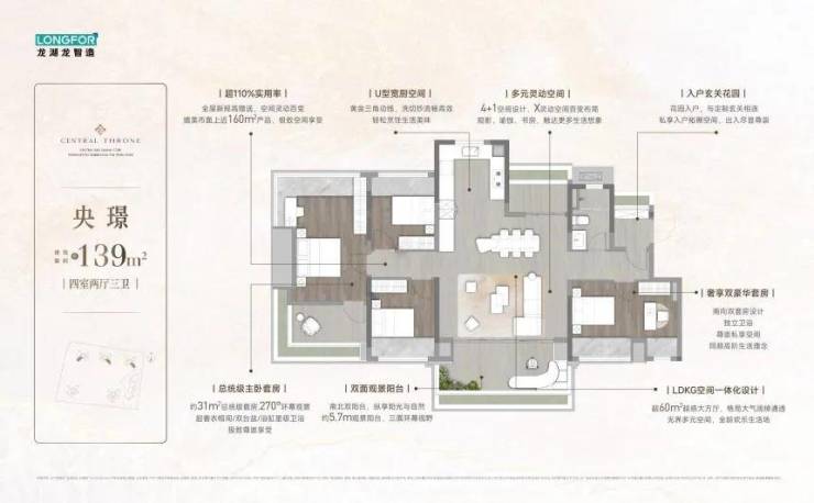 户型选择覆盖刚需到改善需求,目前在售的涵盖95-139㎡三至五房,全系采用0飘窗设计,使用率高达110%至130%,空间利用率突出。