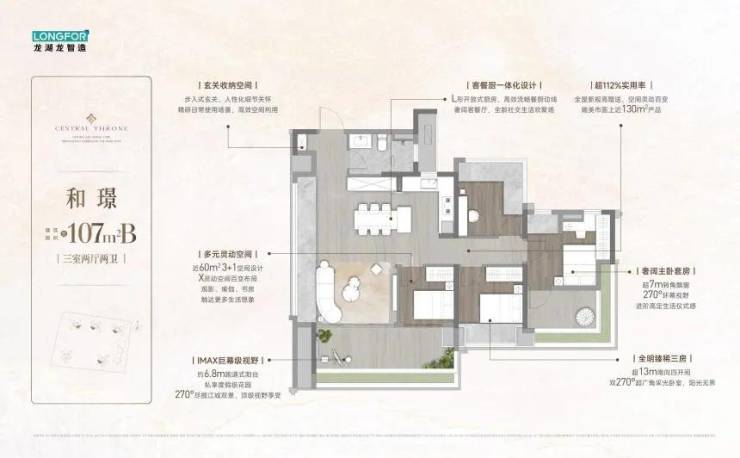 107㎡四房两厅两卫是主力户型,采用LDKG一体化魔方厅设计,配备6.8米270°环幕阳台,南北通透,主卧带独立衣帽间,南向采光面总长超13米,目前货量相对充足。