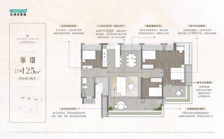 125㎡四房两厅两卫空间更开阔,采用横厅设计,搭配景观阳台,能俯瞰中央园林,适合多人口家庭。