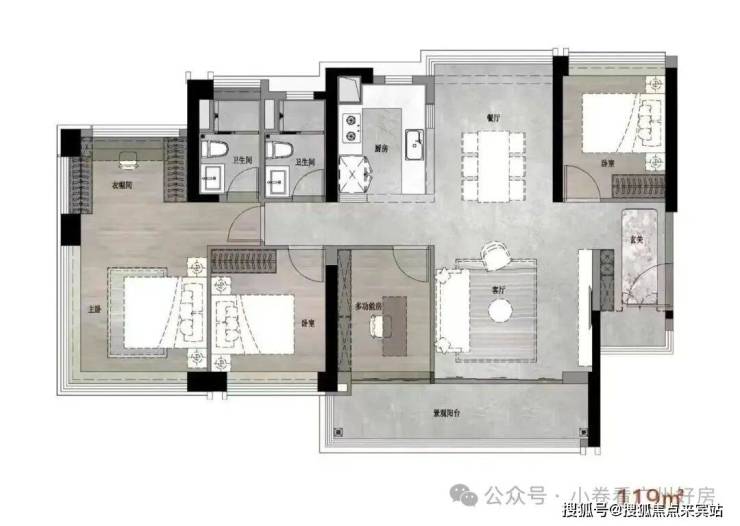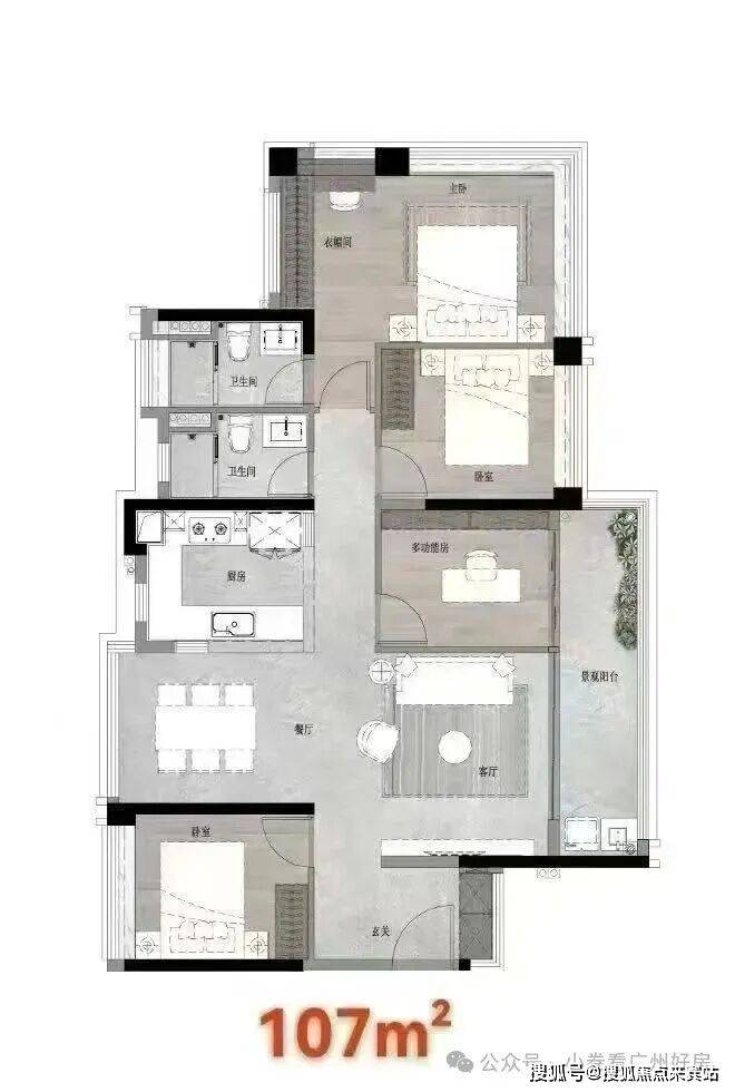 建面约118平旗舰四房户型,全屋做到五开间朝南+南北对流。