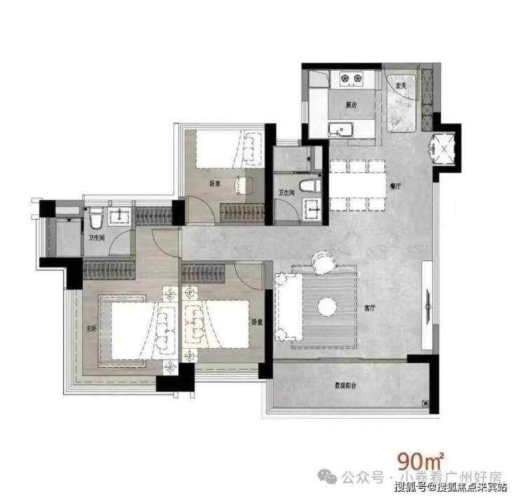 约89平户型,全屋做到四开间朝南,客厅开间也做到约5.2米。