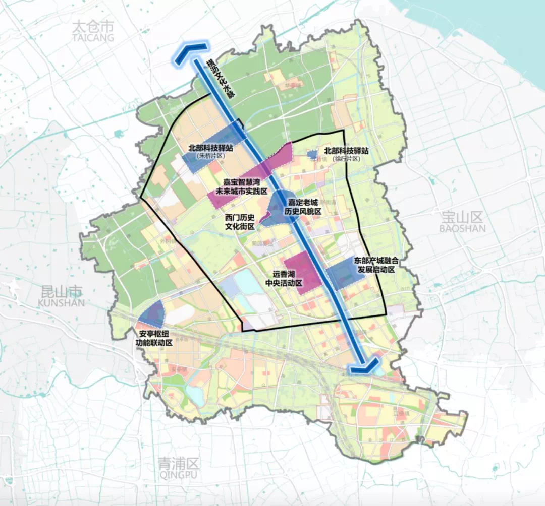 嘉定新城功能布局和空间格局上,立足打通长三角一体化和虹桥国际开放枢纽的链接通道,进一步优化嘉定新城空间结构和功能布局,实施“北拓西联”扩区计划:向北,拓展至嘉定工业区北区,规划面积扩大至159.5平方公里;向西,联动安亭枢纽,形成2.2平方公里的交通枢纽功能联动区,整体构建“一核一枢纽、两轴四片区”的城市空间新格局。