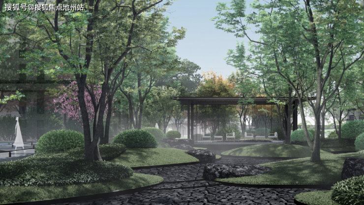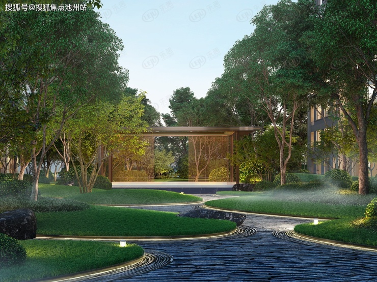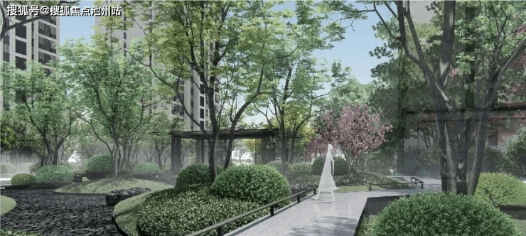 采用新中式风格营造园林,提取山水雅集中的意境场景,再现《十咏图》美学意境,以“长安上境 风雅栖居”为设计理念,形成一环两轴三苑景致,延续国际审美东方风雅。