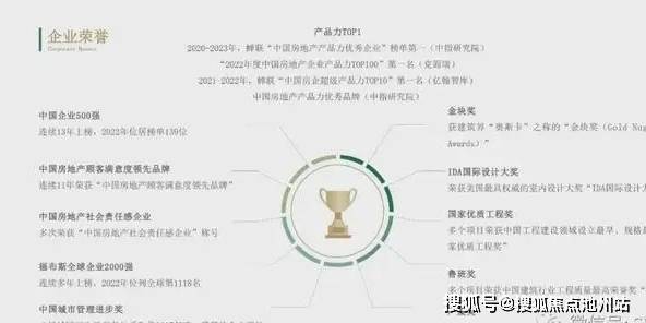 凭借行业领先的产品实力,连续19年位居“中国房地产百强企业综合实力TOP10”、连续12年在“中国城市居民居住满意度”调查中全国领先、2020-2023年蝉联“中国房地产产品力优秀企业”榜单第一 (中指研究院)、多个项目荣获中国工程建设领域设立最早、规格最高的“国家优质工程奖”等荣誉。