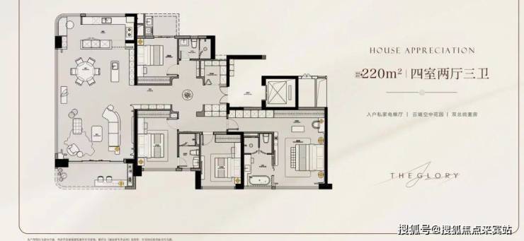 项目外立面以香槟金铝板与晶钻叠层玻璃构筑“珠江之镜”,并以零涂料外立面刷新城市颜值上限。园林方面,330米中轴园林贯通南北双园,设计上以“礼序对仗”为核心,将中国传统建筑美学与现代都市生活完美融合,打造了一条充满仪式感的归家动线。
