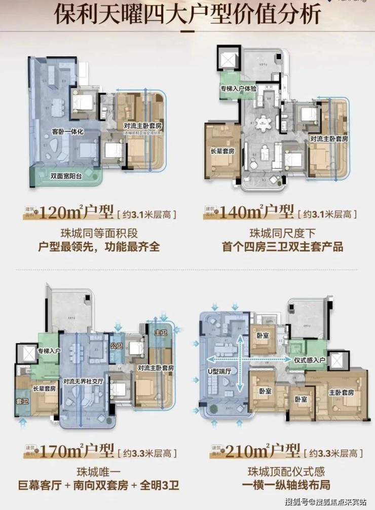 保利天曜南地块是珠城东近十年来首个2T2低密板楼社区,楼间距最宽达74余米。板楼设计享有专梯专户的私密居住体验。北地块的120㎡户型是珠江新城板块内首个同尺度四房产品,稀缺性极高,并且,在售产品做到户户朝南并预留三条视觉通廊,通风,日照,景观同样优越。
