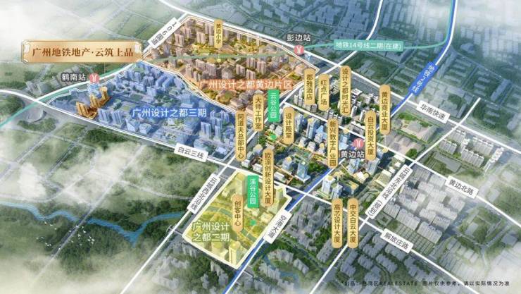 再来看看交通方面的,既然是广州地铁开发的项目,那地铁上盖这个肯定是少不了的。地铁14号线的二期鹤南站(建设中),距离小区就200米,设计之都的三期和鹤南站的A出口地下连接,小区下楼就可以直接到设计之都三期。小区到目前已经通车的地铁2号线黄边站也是1公里左右的距离。华南快速干线、环城高速、白云大道、空港大道、机场高速等多条主干道环绕,达到广州各区都非常方便,30分钟就可以到达广州白云国际机场。