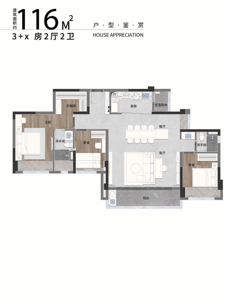 ➯建面约116㎡3+X房2厅2卫: