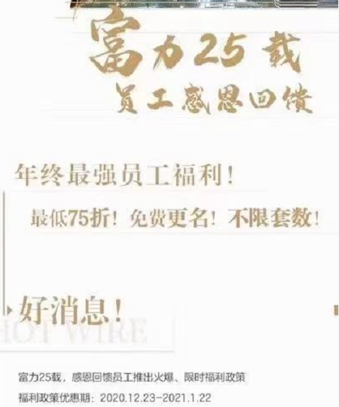 对这次内部大促销,富力地产也没藏着掖着,既没有打招呼“不得外传”,其员工的朋友圈转发海报也没有设置“仅老板可见”,也难怪被质疑“变相促销”。