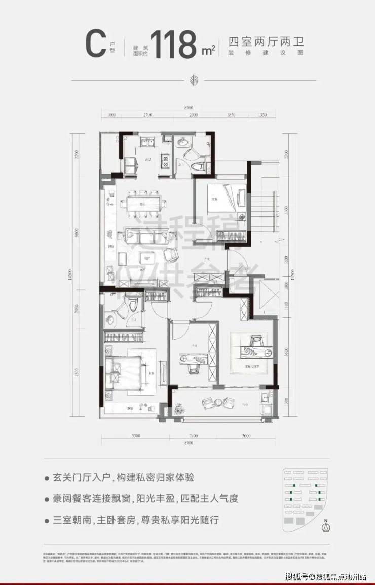,三开间朝南+南向双开间阳台。在洋房得房率的加持下,套内面积比肩高层建面约130㎡户型。