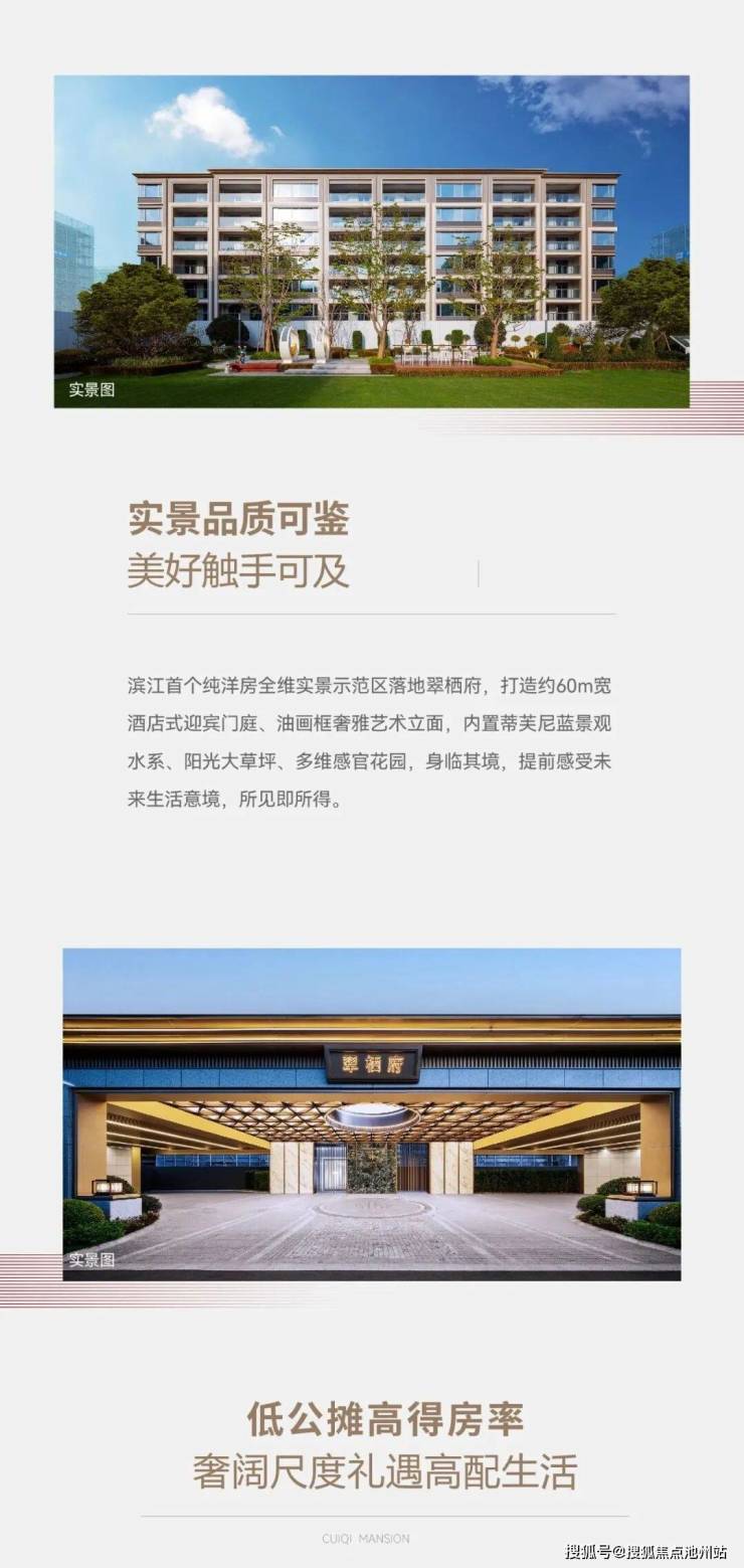 景观园林沿用了滨江经典园林,园区设有一心:中央湛蓝泳池,以灵动之美,凝练园林艺术精髓。双轴:双重景观轴线,形成尊贵、礼序的归家仪式感。五大宅间生活美学体验区:室外泳池、羽毛球场、多功能架空层聚齐,外立面局部采用石材、铝板幕墙设计,赋予建筑温润质感,三段式立面呈现建筑对称之美。