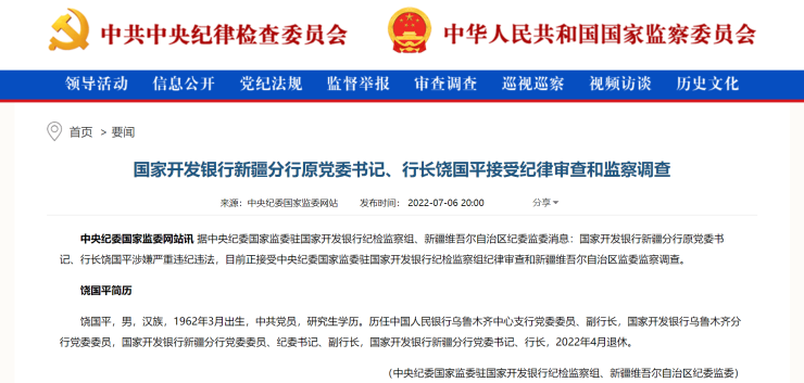 焦点财经讯 据中央纪委国家监委驻国家开发银行纪检监察组、新疆维吾尔自治区纪委监委消息:国家开发银行新疆分行原党委书记、行长饶国平涉嫌严重违纪违法,目前正接受中央纪委国家监委驻国家开发银行纪检监察组纪律审查和新疆维吾尔自治区监委监察调查。