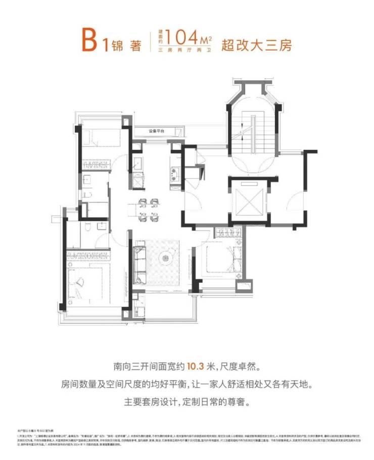 建面约104㎡3房2卫,南向三开间面宽更是达到了约10.3米,视野更通透,采光面更大。餐厅空间进阶,可放下更大餐桌;空间无任何过道浪费,享受更舒适的尺度感和品质空间;