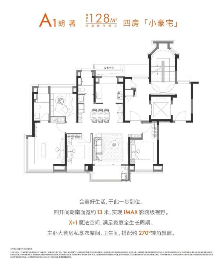 建面约128㎡舒适4房, 4开间朝南面宽约13米,X+1可变灵动空间,7飘窗设计,满满豪华感;其中主卧大套房+270度转角飘窗设计,超强观景视野和采光尺度,未来毫无疑问是板块内稀缺性标杆产品。