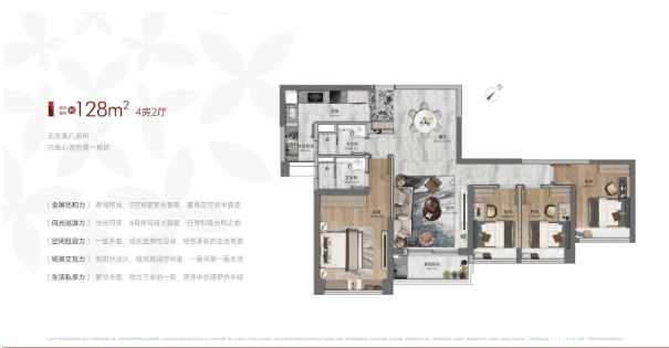 整个项目只有6栋楼,半围合式分布,45度“风车”户型联排,做到不同的户型的主要室内空间都朝南向排布,尤其卧室空间,几乎做到了100%朝南。