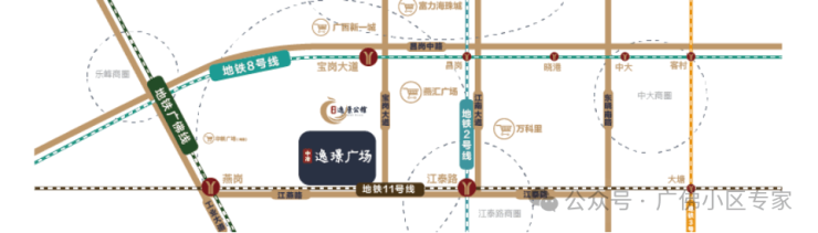 紧邻2号线/8号线/广佛线、11号线(在建中)四条地铁,三横(昌岗路,江燕路,环城高速)五纵(江南大道、宝岗大道、工业大道、广州大道、东晓路)立体交通路网轻松速联广州各城区,约30分钟畅达广州南站与珠江新城,约60分钟达白云机场。