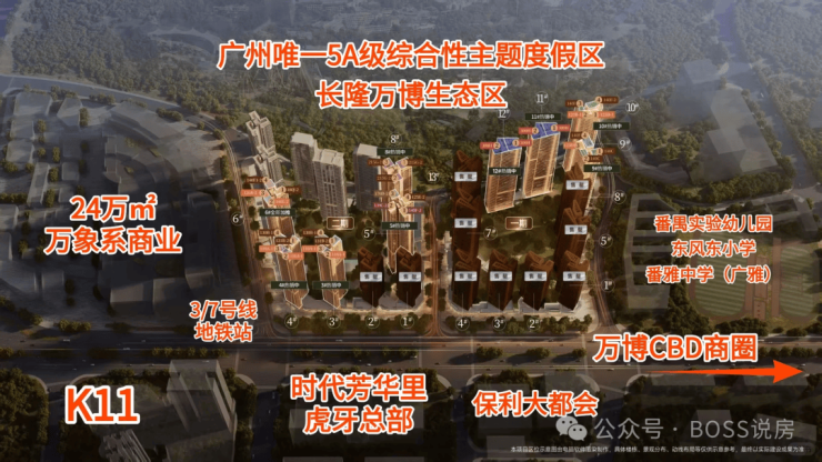 华润置地长隆万博悦府,住宅地块主要分为两期开发,目前一二期均在售,另外还包含了两块商业用地,其中一块配建万象商业,和中小学用地(配建21班幼儿园+72班东风东小学+38班广雅中学),是目前广州在售项目中,为数不多集学铁商的项目之一;
