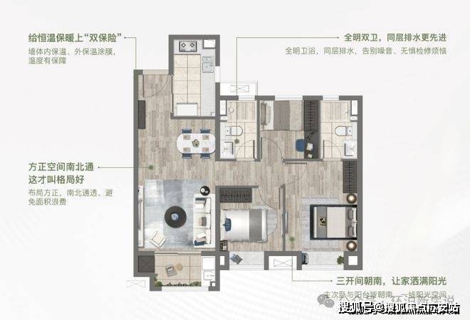 1、约86㎡两房,全明户型设计,空间可观,南北通透,尺度开阔。