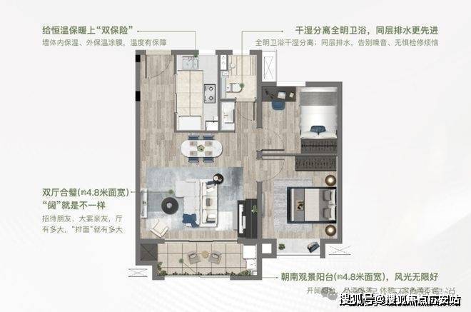 2、客厅与餐厅连为一体,约4.8米大面宽设计,外连观景阳台,拥揽四季的人生景致。