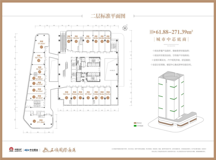 【楼栋概况】楼体高度110米,地下二层地上22层,1-4层为城市中芯底商,首层层高约6米、2层层高约为4.5米、3/4层层高约为4.35米;5至18层为国际商务空间,层高约为4.2米。