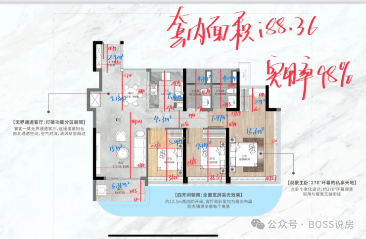 (2)“0飘窗”黑科技:虽然阳台率从25%降到20%,但通过“0飘窗+薄墙体”设计,实际使用率120%,相当于107㎡户型能当128㎡用,直接叫板天河125㎡产品。